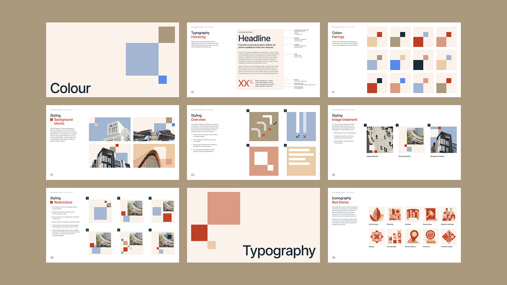 Promoting high-quality baukultur – which means ‘building culture’ – is the alliance’s key objective and as such we wanted the brand to stand as a highly-crafted mark of quality wherever it lives. Building off Swiss design principles through clean typography and strong, gridded compositions, the alliance’s identity plays off the concept of building blocks with a dynamic, square motif. The logomark leans on the idea of craftsmanship by revealing the geometric construction of individual letterforms to form a clean, typographic mark.