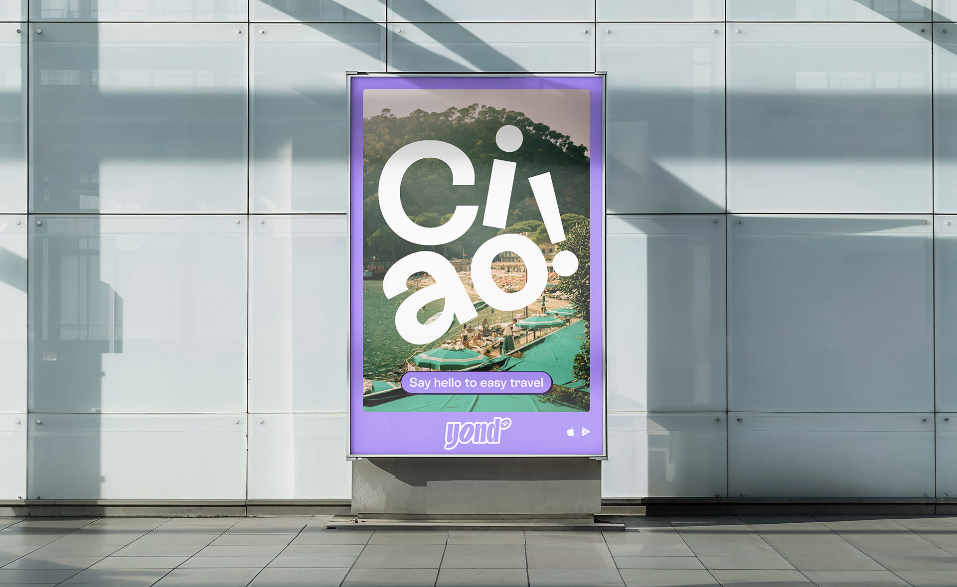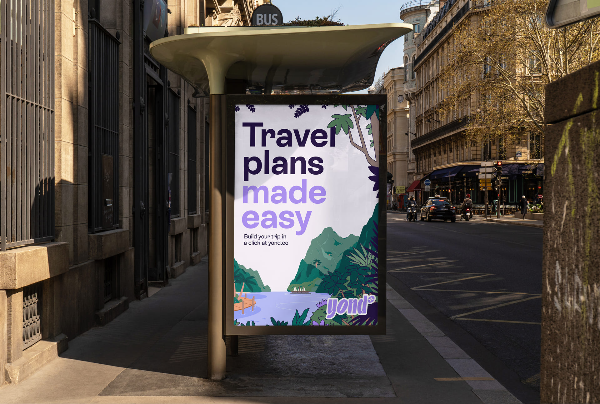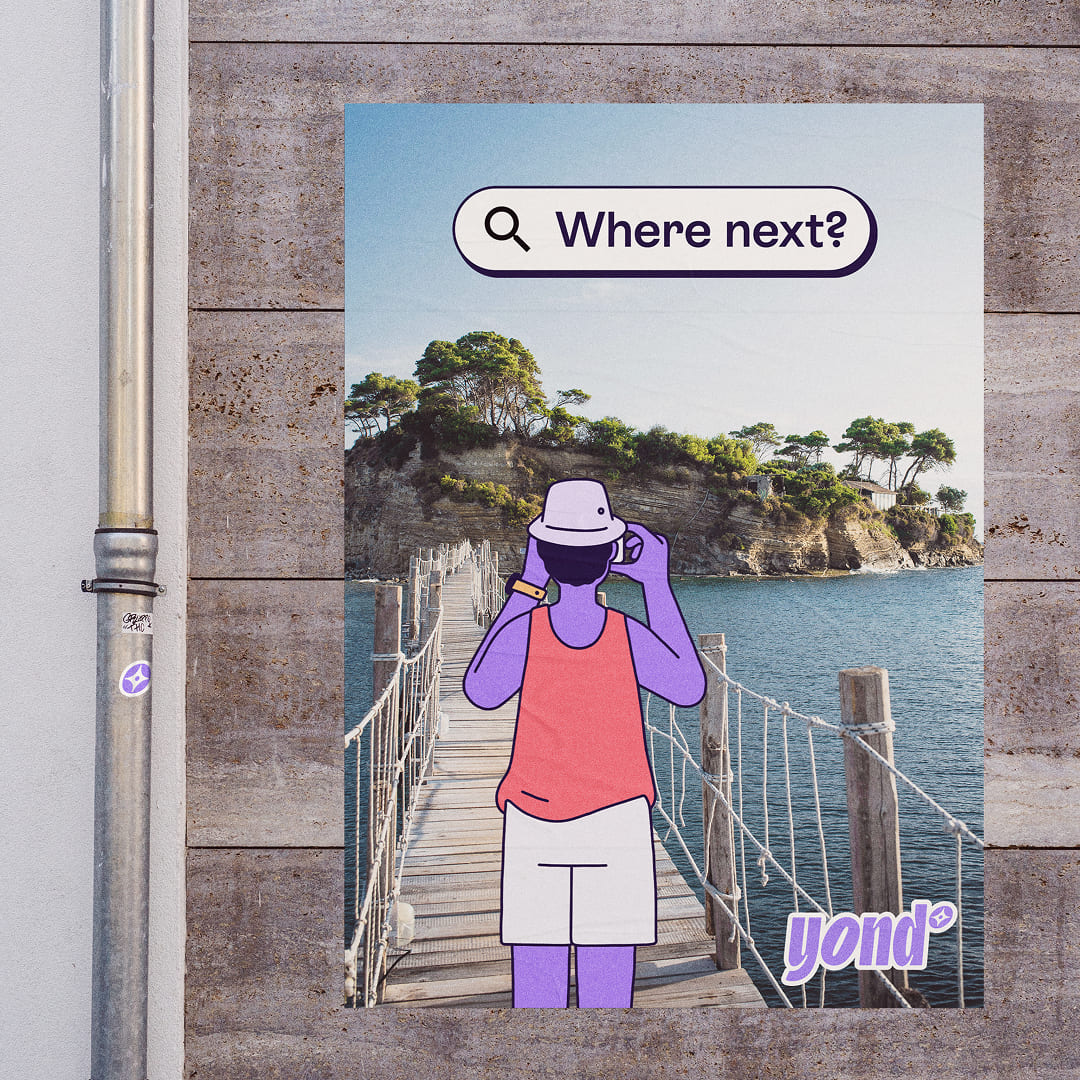 Looking to target a younger generation, we crafted an energetic brand, combining playful illustrations with a bold graphic style that can be seamlessly applied across brand outputs, from eye-catching, out-of-home applications to conceptualising the app design. The Yond logo combines bold, condensed typography with a compass motif to form a bouncy, dynamic mark, reminiscent of luggage stickers.